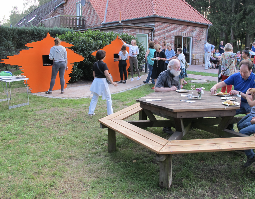Otra obra similar sería Population Pyramid Grill Station (2019) (fig. 7, 8, 9), una escultura participativa de Llobet & Pons instalada en el espacio público de Behningen, un pueblo alemán cercano a Hamburgo. La obra se desarrolla a través de un proceso de diálogo con los/as habitantes, en el que se les consulta qué objeto urbano debería realizarse en su espacio público. Esta escultura consta de una zona de barbacoa y de dos estructuras de acero, cuyo diseño corresponde con la pirámide de población de esta zona para los años 2019 y 2029. Al comparar ambas esculturas se evidencian los desafíos más apremiantes que afectan a la realidad local: la despoblación y el envejecimiento de las zonas rurales en Alemania. Los/as jóvenes se ven obligados/as a marcharse hacia las grandes ciudades en busca de oportunidades laborales y salarios más altos, lo que ha generado una situación de emigración generalizada que parece difícil de contener. De esta forma, el espacio escultórico que crea Population Pyramid Grill Station invita a la reunión, celebración y contacto entre los/as residentes del lugar, mientras les recuerda la dura realidad del éxodo rural que les afecta actualmente y durante la próxima década.